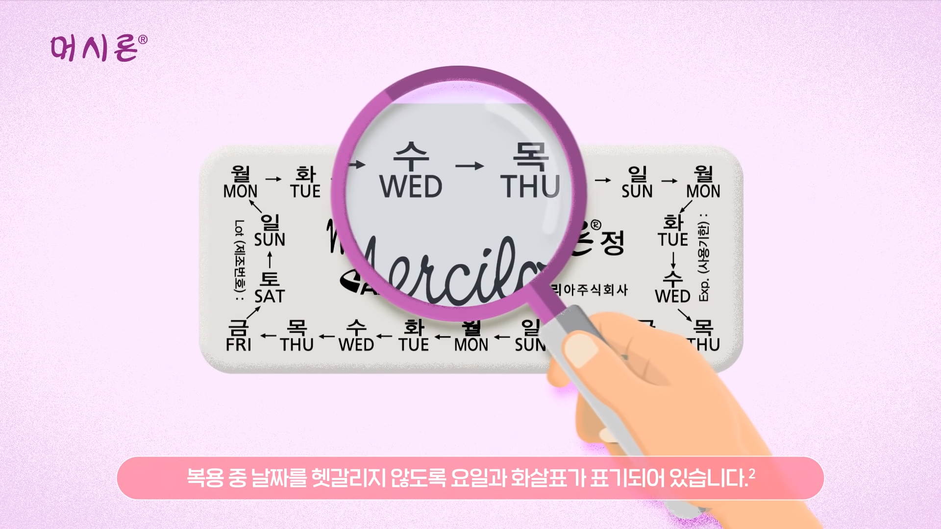 머시론 포장 뒷면을 보면 복용 중 날짜를 헷갈리지 않도록 하기 위해 복용 요일이 표기되어 있으니 화살표를 따라 적절히 드시길 바랍니다 :)
