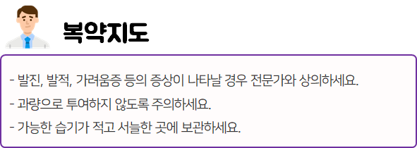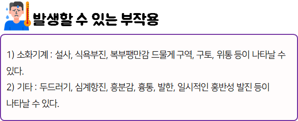 또한 복용 중 부작용 등의 이상반응이 나타날 시 즉시 복용을 멈추고, 전문가 or 의사와 상담하신 후에 복용 지속 여부를 결정하시는 것이 좋습니다.