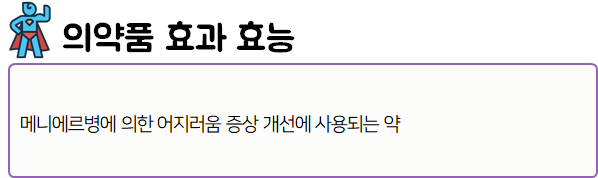 이 의약품은 메니에르병에 의한 어지러움, 이명(귀울림), 청력저하 등을 치료하는데 사용합니다.이니 참고하시길 바랍니다.