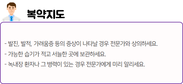몸에 맞지 않는 의약품의 경우 크고 작은 이상 반응을 불러일으킬 수 있으므로 드시기 전에 반드시 부작용이나 주의사항 등을 미리 확인하시길 바랍니다.