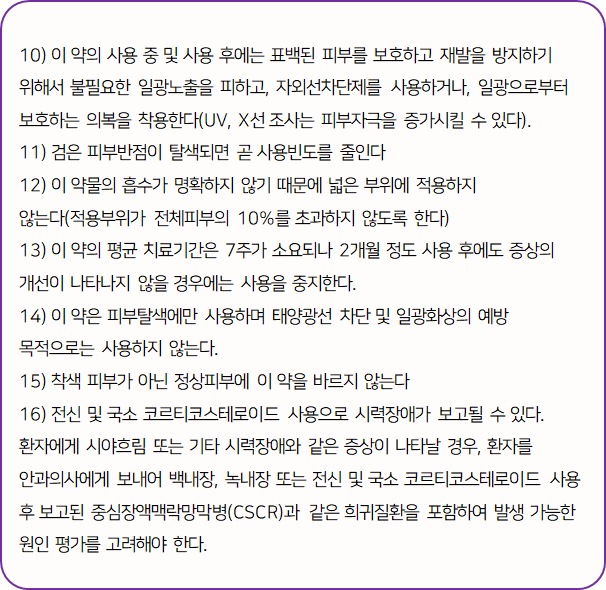 이 의약품은 멜라닌 색소의 생성을 억제하며, 색소침착 부위에서 미백작용을 나타내는 약이니 참고하시길 바랍니다.
