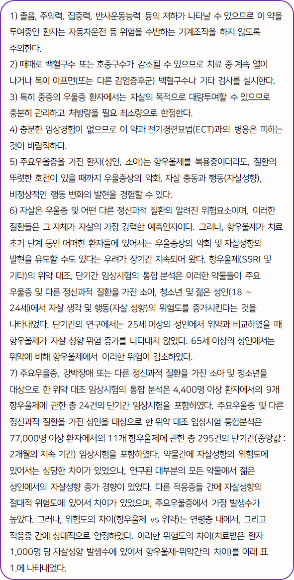 이 의약품은 체내 신경전달 물질의 양을 조절함으로써 항우울 효과를 나타내는 약이니 참고하시길 바랍니다.