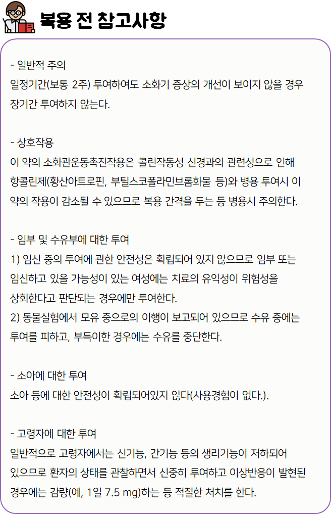 이 의약품은 '위장운동을 활성화시킴으로써 소화장애로 인한 각종 증상을 개선하는 약'이니 참고하시길 바랍니다.