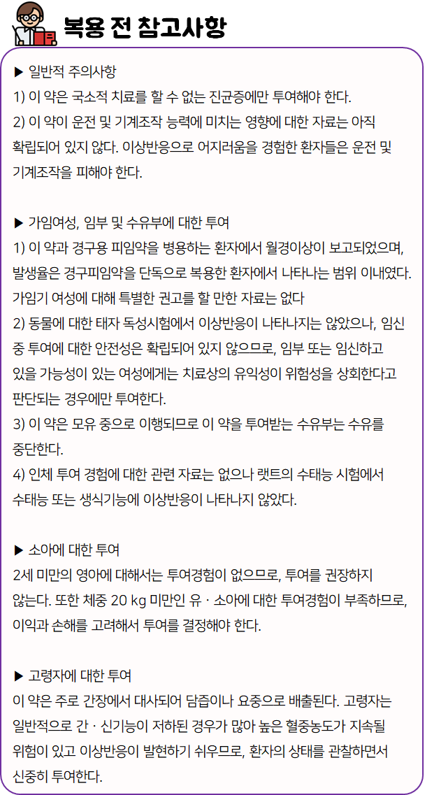 이 의약품은 항진균 작용을 나타냄으로써 곰팡이균(진균)에 의한 각종 감염증 치료에 사용하는 약이니 참고하시길 바랍니다.