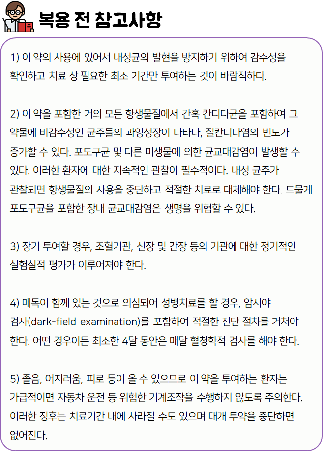 이 의약품은 '항균작용을 나타냄으로써 세균에 의한 각종 감염증을 치료하는 약'이니 참고하시길 바랍니다.