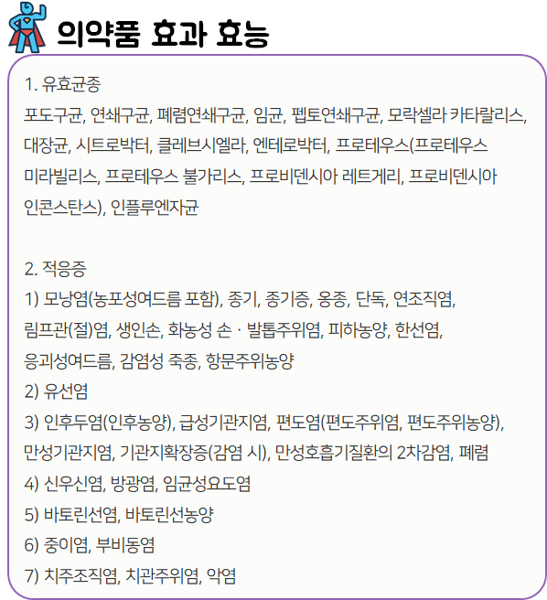 이 의약품은 항균작용을 나타냄으로써 세균에 의한 각종 감염증을 치료하는 약이니 참고하시길 바랍니다.