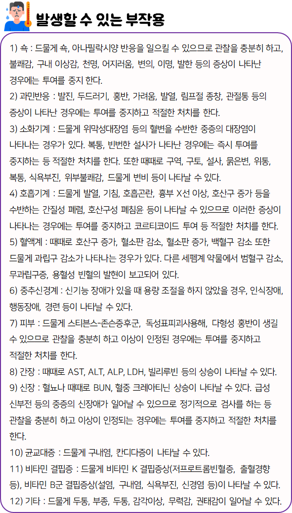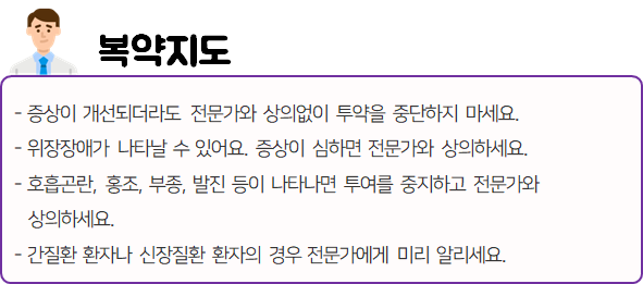 또한 복용 중 부작용 등의 이상반응이 나타날 시 즉시 복용을 멈추고, 전문가 or 의사와 상담하신 후에 복용 지속 여부를 결정하시는 것이 좋습니다.
