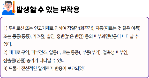 혹시라도 사용 중 부작용이나 각종 이상 반응이 나타나게 되면 즉시 사용을 멈추고, 전문가 혹은 의사와 상담하세요!