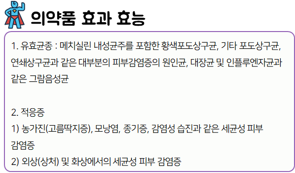 이 의약품은 '항균작용을 나타냄으로써 세균에 의한 각종 감염증을 치료하는 약'이니 참고하시길 바랍니다.