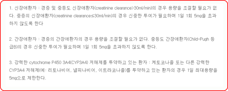 * 신장애환자, 간장애환자, 강력한 사이토크롬 저해제를 투약하고 있는 환자는 용량 조절이 필요합니다.