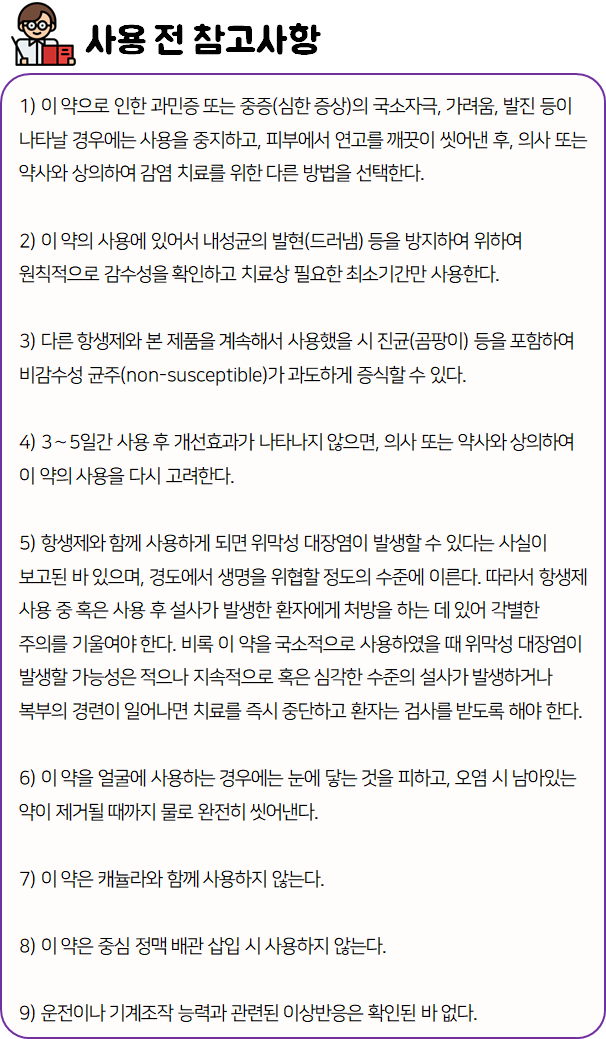 이 의약품은 항균작용을 나타냄으로써 세균에 의한 각종 감염증을 치료하는 약이니 참고하시길 바랍니다.