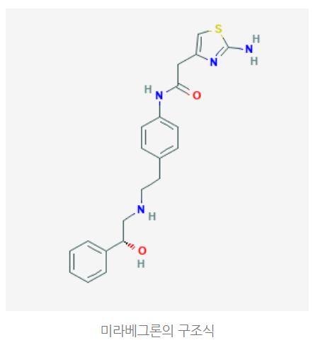 * 미라베그론은 과민성 방광의 증상을 치료하는 약물 성분입니다. 방광의 베타-3 교감신경 수용체에 선택적으로 작용하여 방광 배뇨근을 이완시킴으로써 빈뇨, 요절박, 절박성 요실금 등의 증상을 치료하는데요,  시중에 존재하는 다른 과민성 방광 치료제에 비해 변비나 입마름 등의 부작용이 적은 편으로 알려져 있습니다.