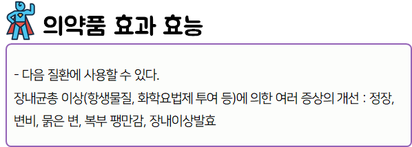 이 의약품은 장내 세균총을 정상화함으로써 장내균총 이상에 의한 여러 증상을 개선하는 약이니 참고하시길 바랍니다.