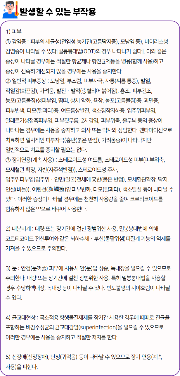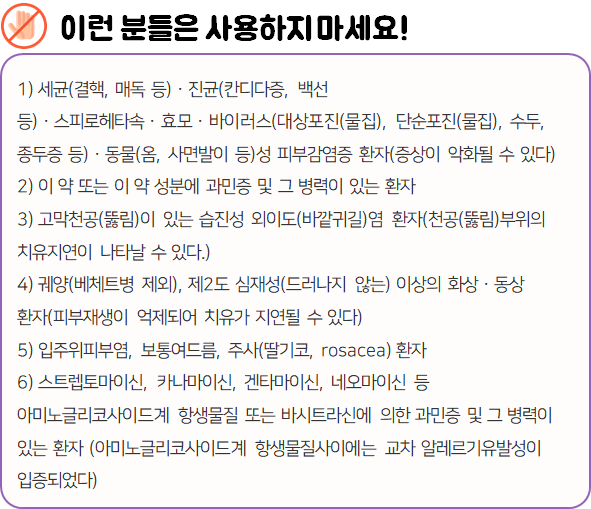 이 의약품은 '항염작용 및 항균작용을 나타냄으로써 세균감염의 위험이 있는 피부질환 치료에 사용하는 약'이니 참고하시길 바랍니다.
