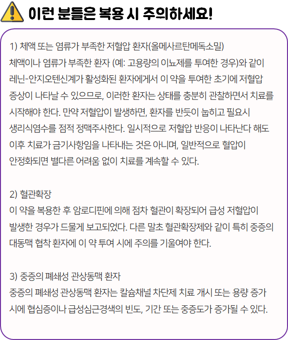 이 의약품은 '혈관확장 작용으로 혈압을 낮추고, 심장 부담을 감소시키며 심장으로의 산소공급을 늘려 주는 약'이니 참고하시길 바랍니다.