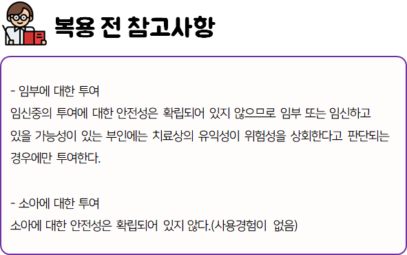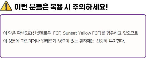 몸에 맞지 않는 의약품의 경우 크고 작은 이상 반응을 불러일으킬 수 있으므로 드시기 전에 반드시 부작용이나 주의사항 등을 미리 확인하시길 바랍니다.