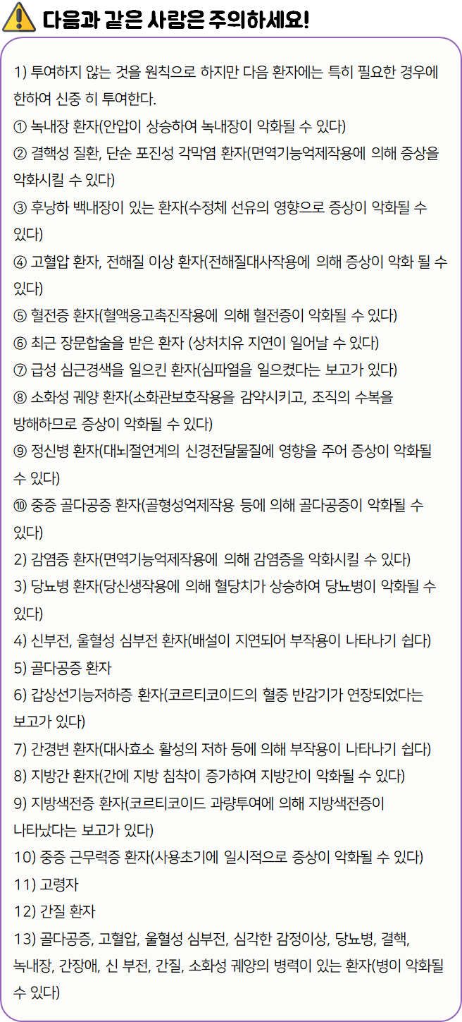 이 의약품은 면역억제 및 항염작용을 나타내는 호르몬제로 내분비장애 또는 각종 염증질환에 사용하는 약이니 참고하시길 바랍니다.
