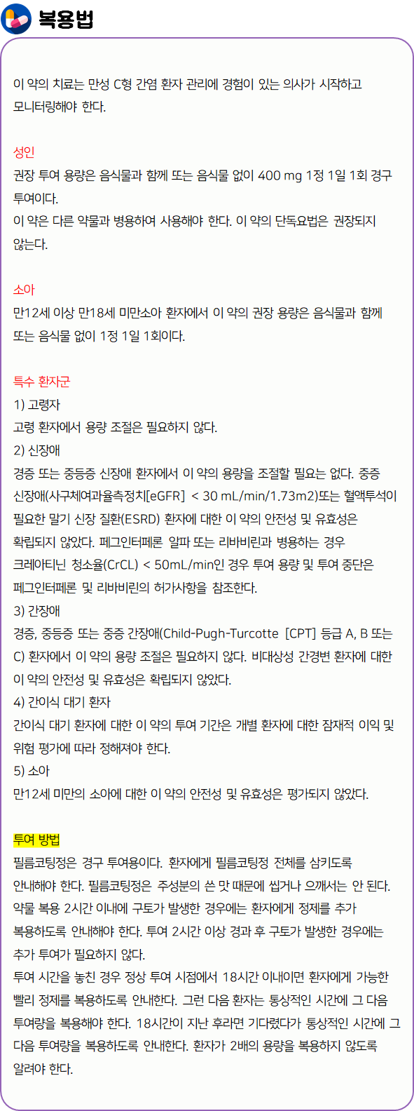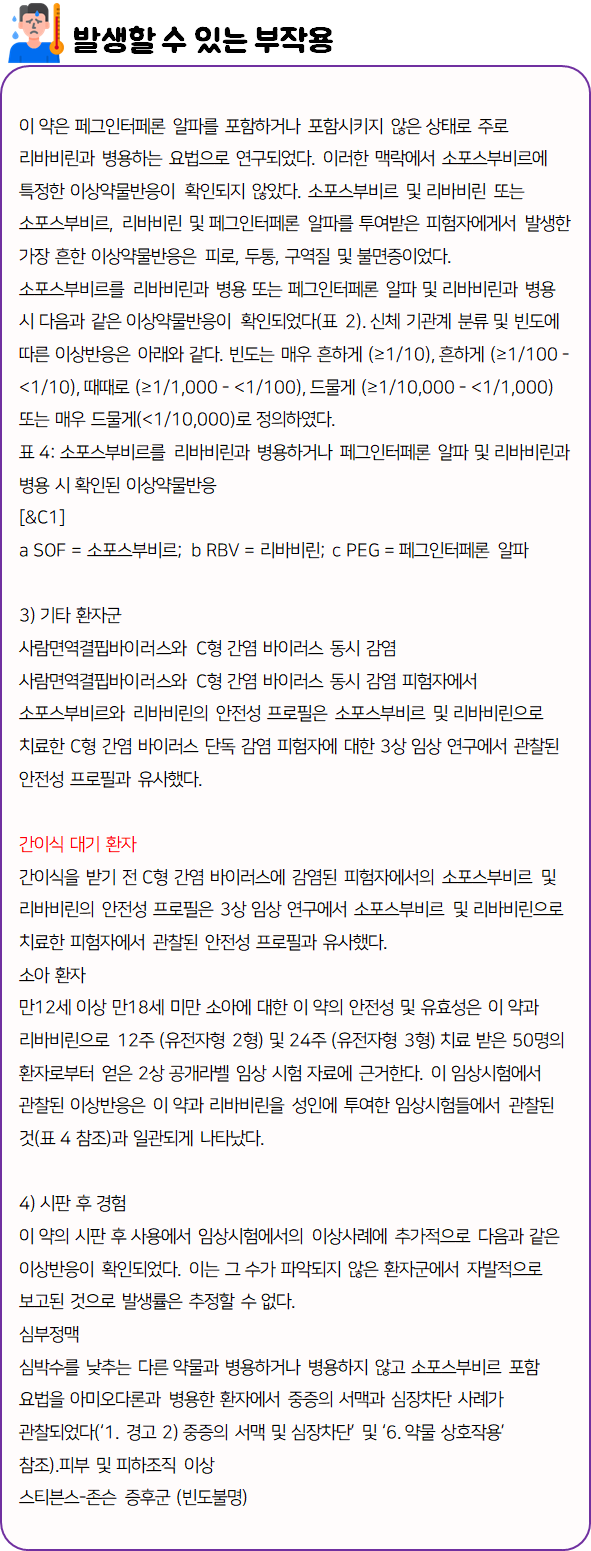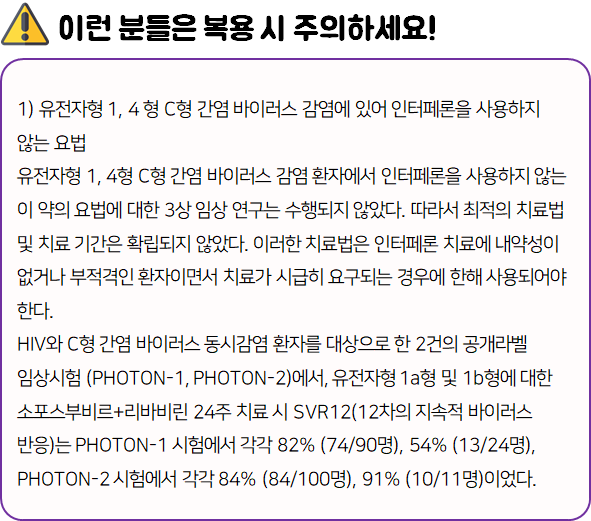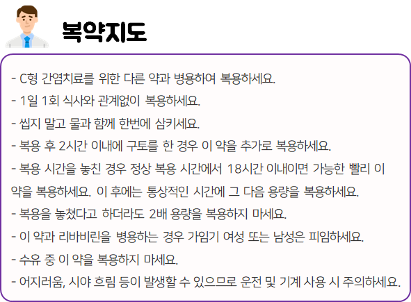 이 의약품은 간염 바이러스의 증식을 억제함으로써 만성 C형 간염을 치료하는 약이니 참고하시길 바랍니다.