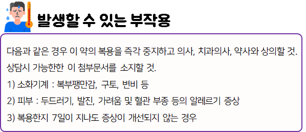 몸에 맞지 않는 의약품의 경우 크고 작은 이상 반응을 불러일으킬 수 있으므로 드시기 전에 반드시 부작용이나 주의사항 등을 미리 확인하시길 바랍니다.