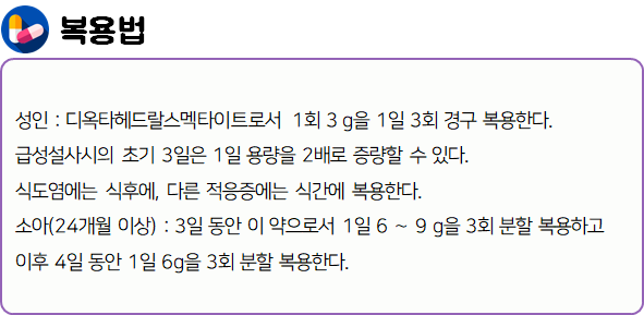 이 의약품은 '장내 유해물질을 흡착, 배설시킴으로써 설사, 복통 등의 증상을 개선하는 약'이니 참고하시길 바랍니다.
