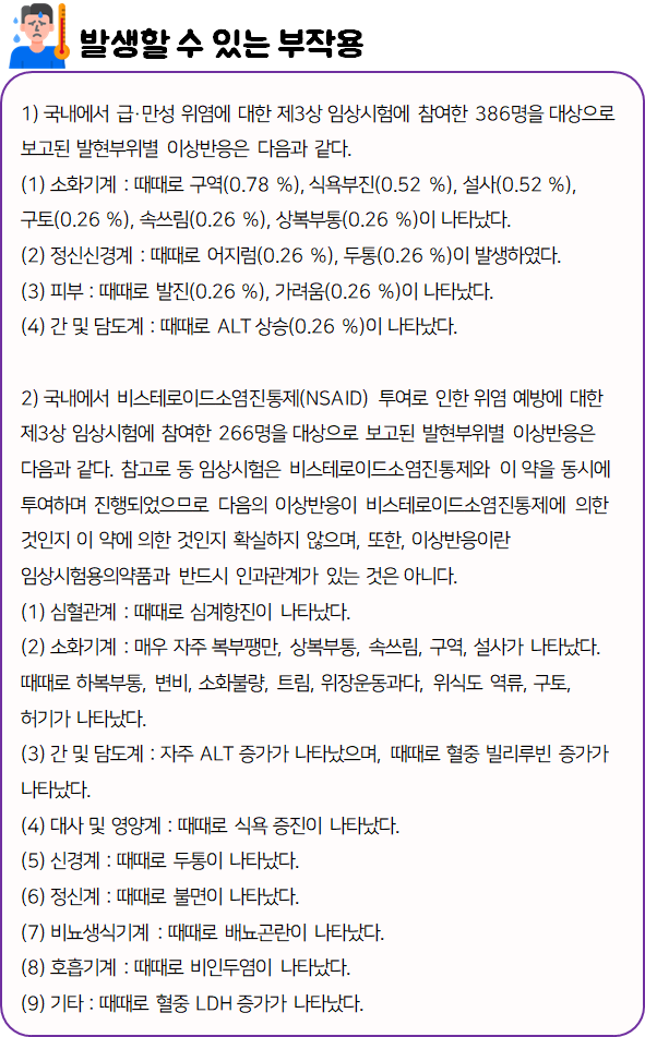 몸에 맞지 않는 의약품의 경우 크고 작은 이상 반응을 불러일으킬 수 있으므로 드시기 전에 반드시 부작용이나 주의사항 등을 미리 확인하시길 바랍니다.