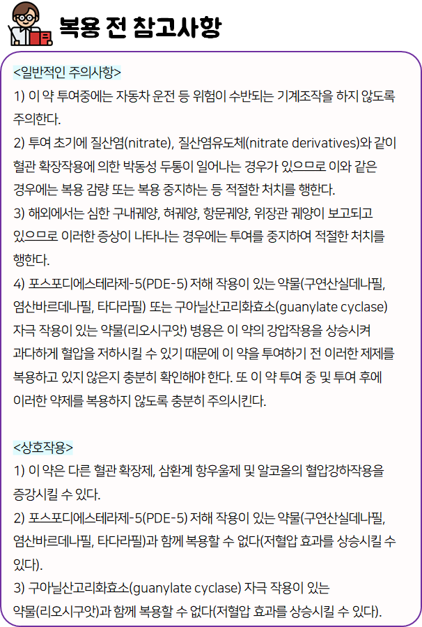 이 의약품은 관상동맥을 확장시킴으로써 심장으로의 산소 및 영양분 공급을 증가시키는 약이니 참고하시길 바랍니다.