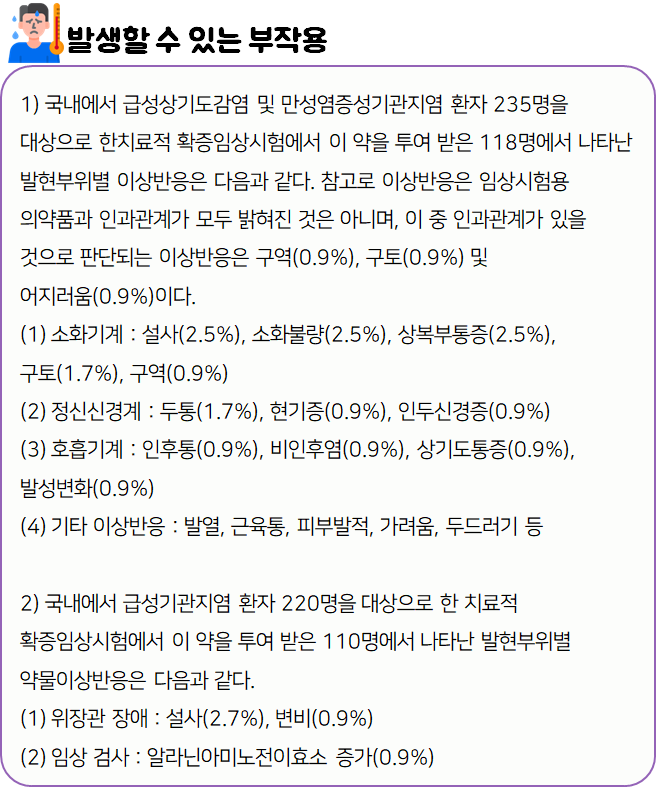 - 이 약을(를) 복용할 시 다음과 같은 부작용이 발생할 수 있으니 주의하시길 바랍니다.