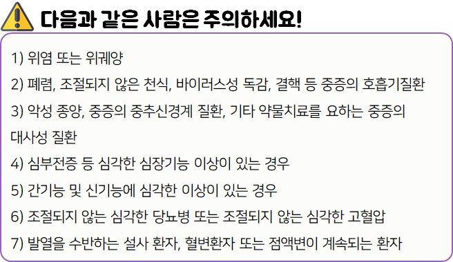 - 다음과 같은 사람은 복용 시 위험할 수 있으므로 복용하지 마시길 바랍니다.
