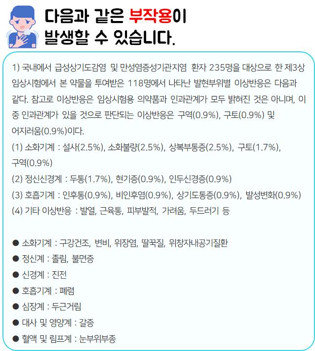 의약품은 반드시 복용 전에 복용 시 발생할 수 있는 부작용이나 주의사항 등을 미리 확인하신 후 드셔야 안전하게 먹을 수 있습니다.