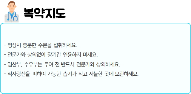 또한 복용 중 부작용이나 각종 이상 반응이 나타나면 즉시 복용을 멈추고, 전문가 혹은 의사와 상담하시어 복용량을 줄이거나 복용을 멈추시길 바랍니다.