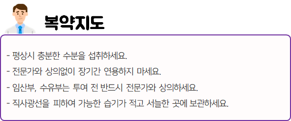 또한 복용 중 부작용 등의 이상반응이 나타날 시 즉시 복용을 멈추고, 전문가 or 의사와 상담하신 후 복용량을 줄이거나 복용을 멈추시는 것이 좋습니다.