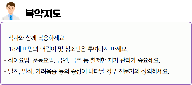 또한 혹시나 복용 중 부작용 등의 이상반응이 나타날 시 즉시 복용을 멈추고, 전문가 or 의사와 상담하신 후에 복용 지속 여부를 결정하시는 것이 좋습니다.