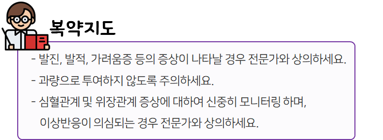 또한 복용 중 이상 반응이 나타나면 즉시 복용을 멈추고, 전문가나 의사와 상담하셔서 복용량을 줄이거나 복용을 멈추시는 것이 좋습니다.