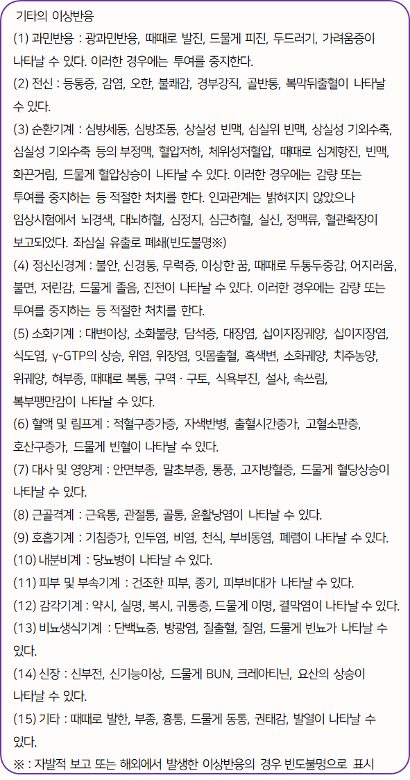몸에 맞지 않는 의약품의 경우 크고 작은 이상 반응을 불러일으킬 수 있으므로 드시기 전에 반드시 부작용이나 주의사항 등을 미리 확인하시길 바랍니다.
