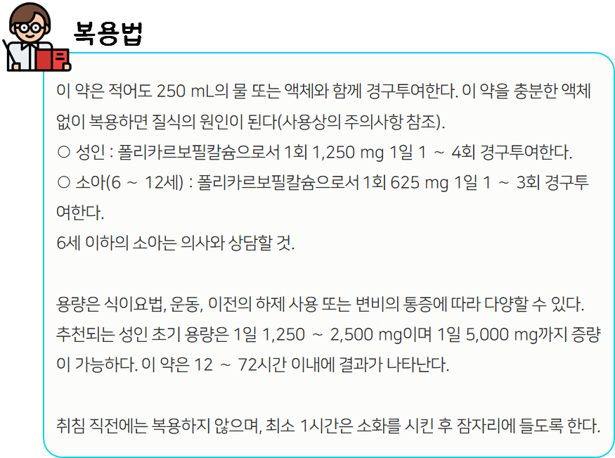 이 의약품은 변에 수분을 함유시키고 그 부피를 증가시켜 정상적인 배변활동을 돕는 약이니 참고하시길 바랍니다.