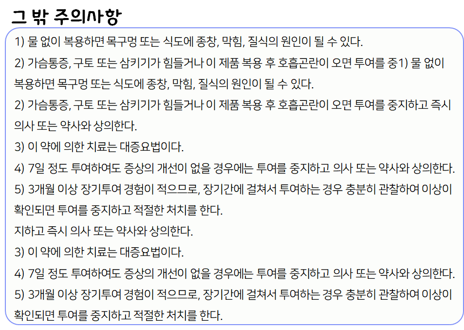 또한 복용 중 부작용 등의 이상반응이 나타날 시 즉시 복용을 멈추고, 전문가 or 의사와 상담하신 후 복용량을 줄이거나 복용을 멈추시는 것이 좋습니다.