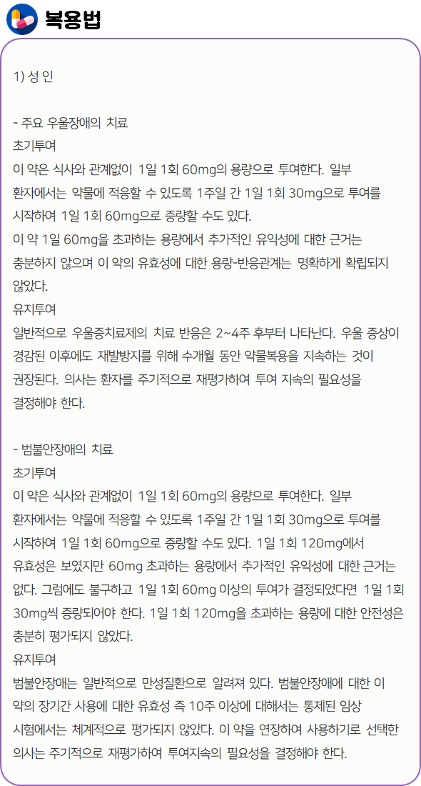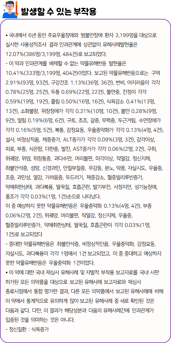 이 의약품은 "체내 신경전달 물질의 양을 조절함으로써 항우울 효과를 나타내는 약"이니 참고하시길 바랍니다.