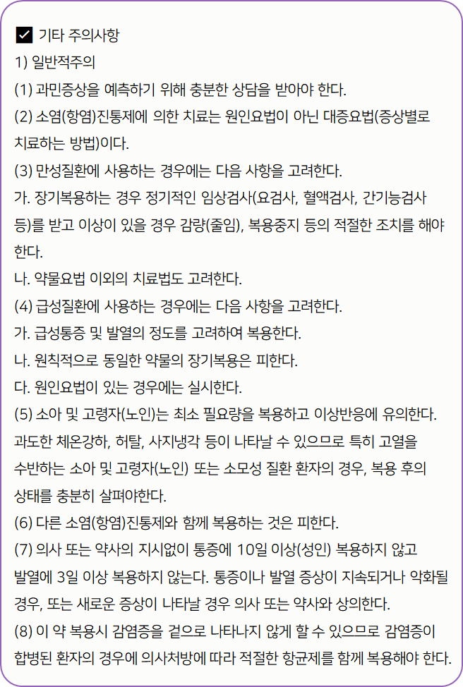 이 의약품은 체온조절중추에 작용하여 열을 내리고, 통증을 해소하는 약이니 참고하시길 바랍니다.