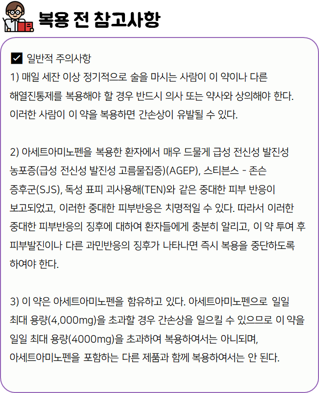 이 의약품은 체온조절중추에 작용하여 열을 내리고, 통증을 해소하는 약이니 참고하시길 바랍니다.