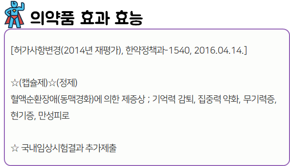 이 의약품은 혈관보호 및 혈관확장 작용을 통해 혈액순환을 촉진하고, 뇌기능을 개선시켜주는 혈액순환 개선제이니 참고하시길 바랍니다.