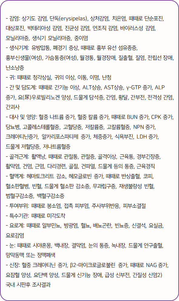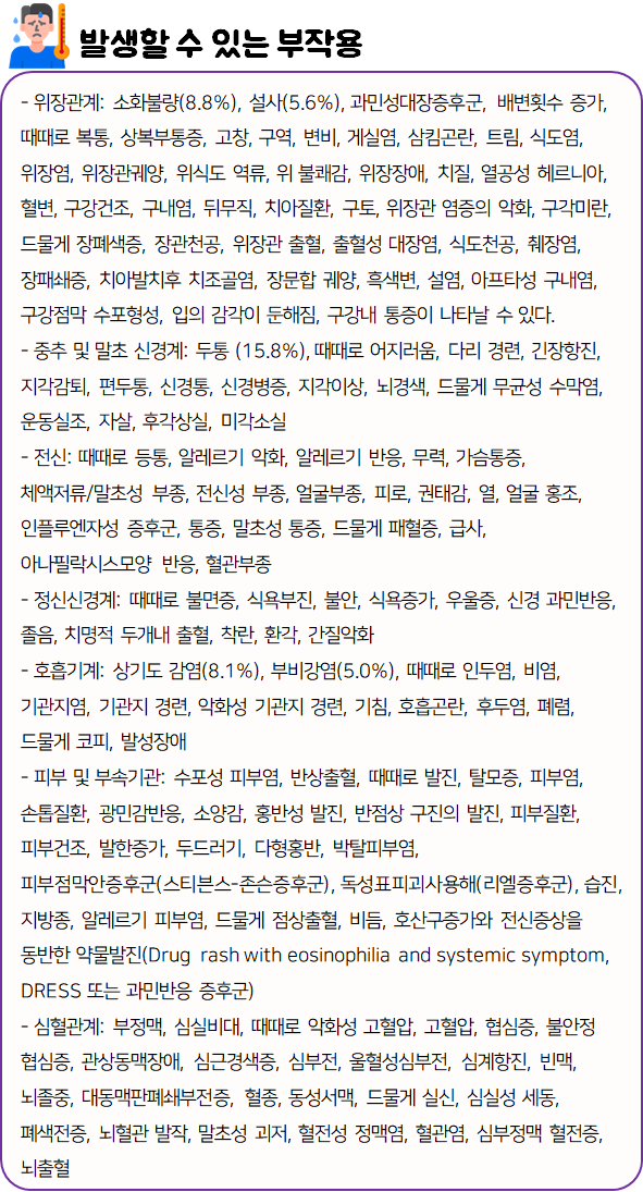 또한 복용 중 부작용 등의 이상반응이 나타날 시 즉시 복용을 멈추고, 전문가 or 의사와 상담하신 후 복용량을 줄이거나 복용을 멈추시는 것이 좋습니다.