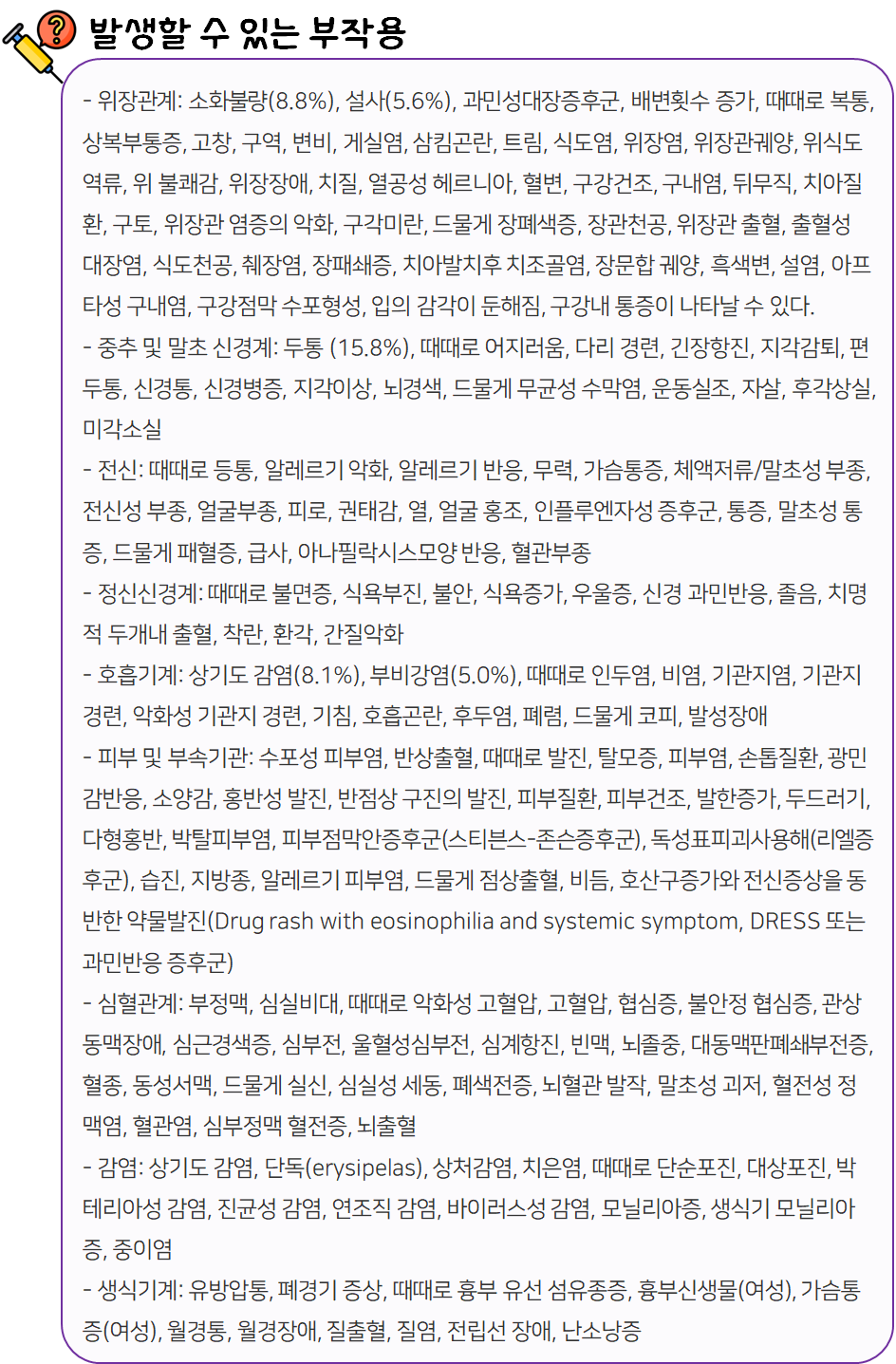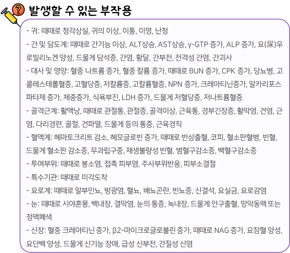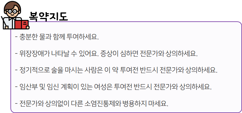 또한 복용 중 부작용 등의 이상반응이 나타날 시 즉시 복용을 멈추고, 전문가 or 의사와 상담하신 후 복용량을 줄이거나 복용을 멈추시는 것이 좋습니다.