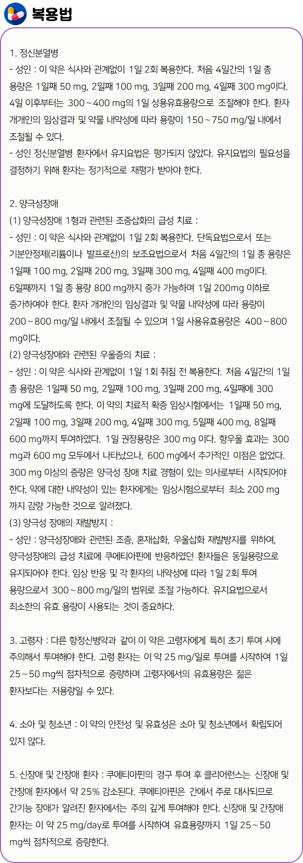 Quetiapine Fumarate : 정신/행동장애 > 기타 항정신병 약물 > 항조증