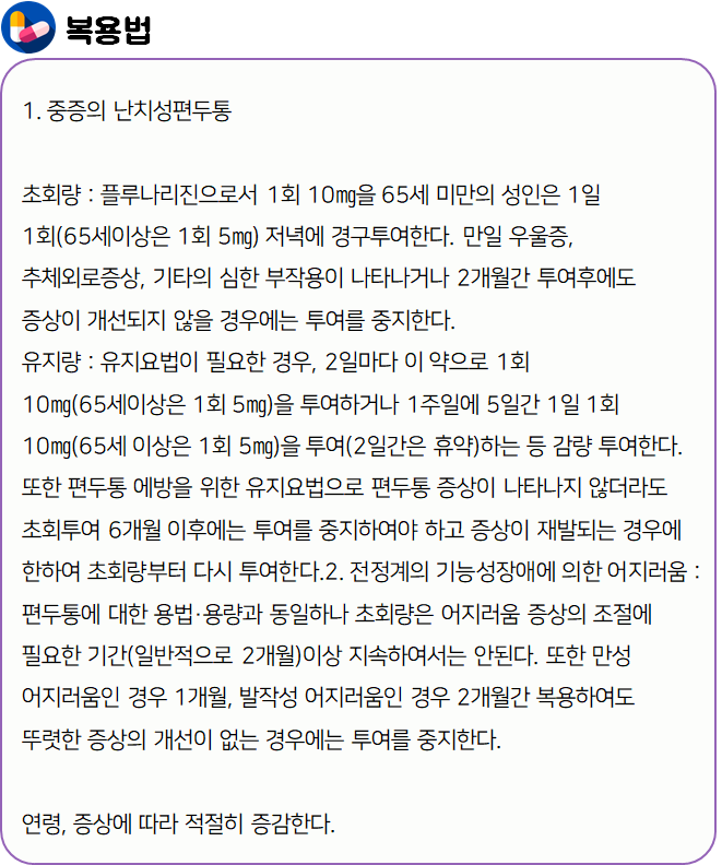 이 의약품은 뇌혈관에 작용하여 편두통의 예방 및 치료 또는 전정계 장애로 인한 어지러움증에 적용하는 약이니 참고하시길 바랍니다.