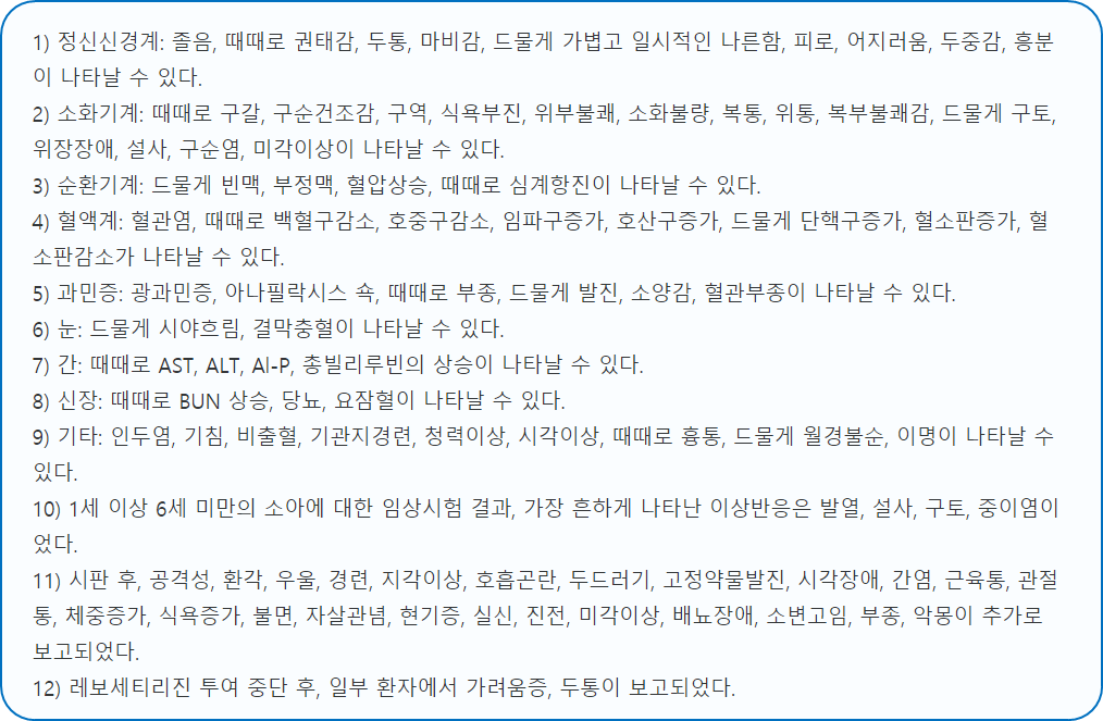 씨잘정 5mg을 복용할 시 다음과 같은 부작용이 발생할 수 있으니 주의하시길 바랍니다.
