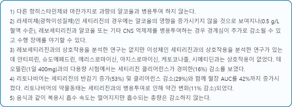 이 의약품을 복용하고 나면 졸림, 피로, 무기력증의 증상이 평소보다 심하게 나타날 수 있으므로 운전이나 위험한 기계를 조작할 시에는 보다 많은 주의가 필요합니다. 또한 중추신경계 작용을 떨어뜨릴 수 있어서 이 의약품을 항우울제와 함께 복용하는 것을 삼가시길 바랍니다.