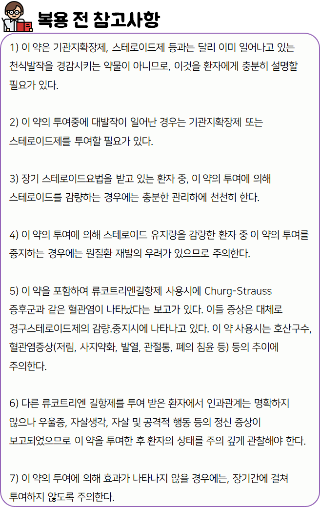 이 약은 1. 기관지 천식 2. 알레르기성 비염 치료에 사용되는 약입니다.