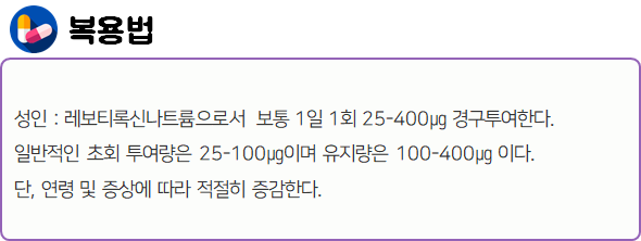 이 의약품은 "갑상선호르몬을 보급함으로써 갑상선기능저하로 인한 증상을 개선하는 약"이니 참고하시길 바랍니다.