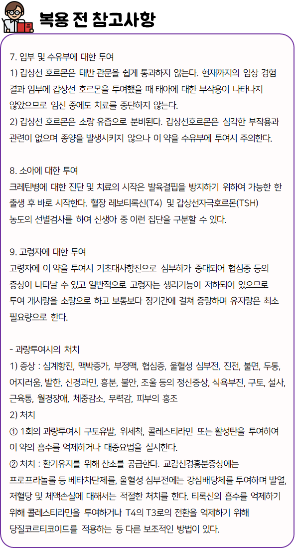 이 의약품은 "갑상선호르몬을 보급함으로써 갑상선기능저하로 인한 증상을 개선하는 약"이니 참고하시길 바랍니다.