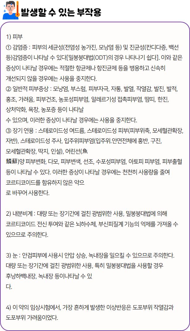 이 의약품은 '항염 및 항소양 작용을 통해 각종 피부질환을 치료하는 약'이니 참고하시길 바랍니다.